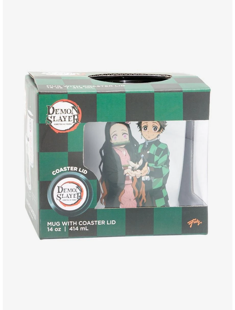 Is your training arc getting the best of you? Relax and enjoy a cup of your favorite beverage after a long day with this mug made to match! Inspired by the hit anime, Demon Slayer: Kimetsu no Yaiba, this mug features a graphic of Nezuko and Tanjiro Kamado on the front, with their names in Japanese kanji lettering underneath the show’s logo on the back. The lid (which also features the show’s logo!) also doubles as a coaster for an easy-to-store matching style!