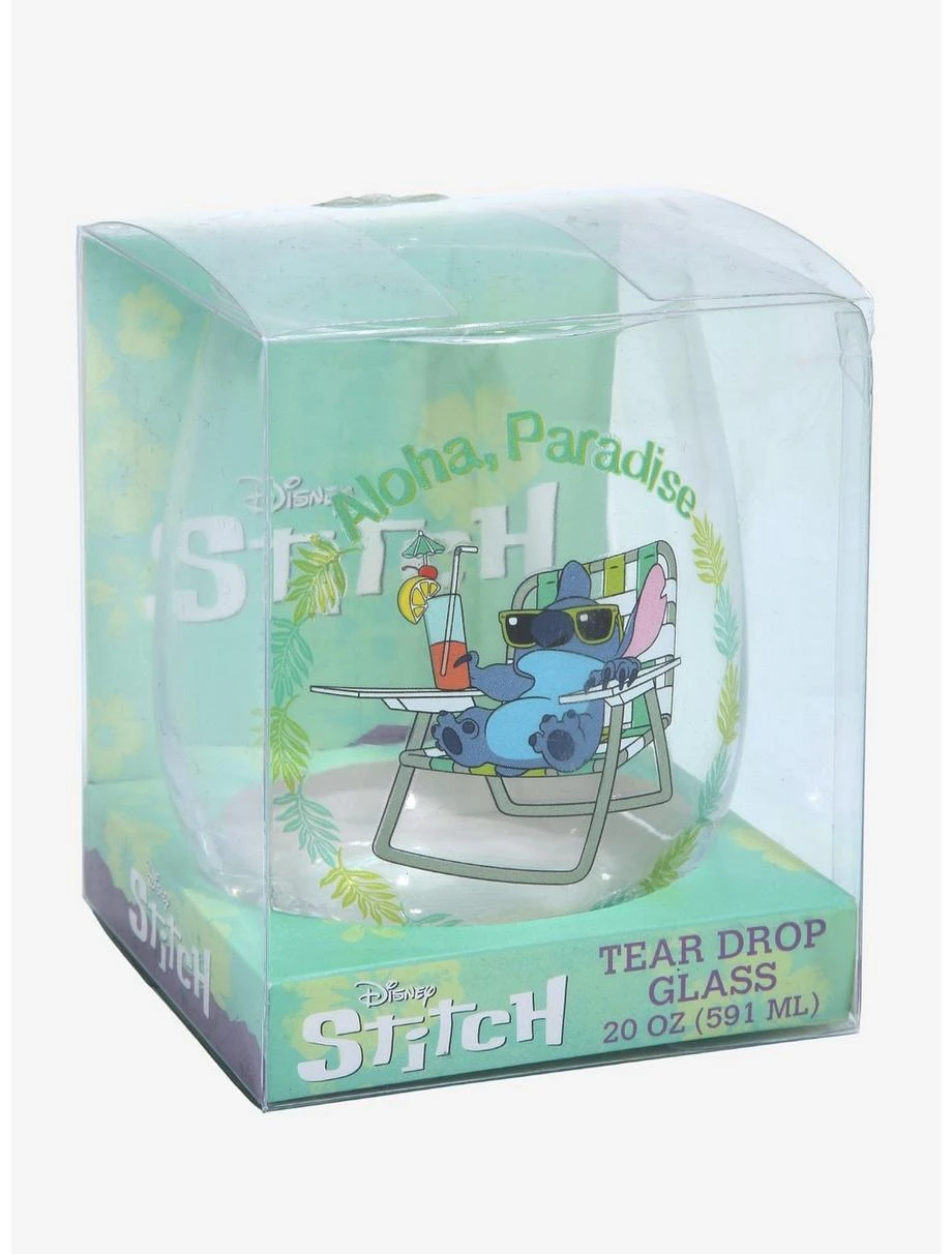 Say “aloha” to your own slice of paradise with this Lilo & Stitch wine glass! Inspired by the beloved Disney film, your favorite little experiment’s relaxing in the vacation sun has he lounges in a chair with this drink in hand. With “Aloha, Paradise” lettering on the top and a leaf border surrounding the front graphic, bringing the beach vibes to your drinkware collection is as easy as sharing a toast with Stitch!Â